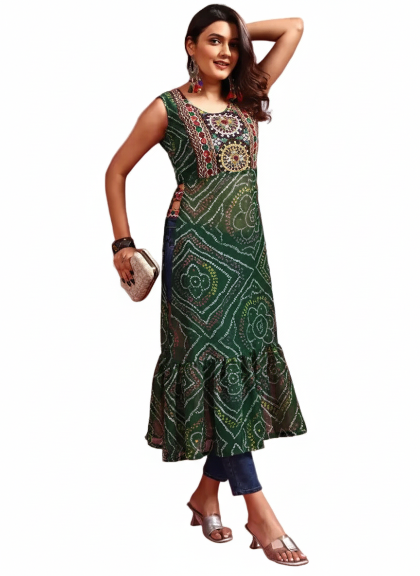 Experience the elegance and charm of our Women’s Bandhani Kurti for Navratri, a perfect blend of tradition and style. Crafted from high-quality georgette, this kurti features exquisite bandhani work that captures the spirit of Navratri celebrations. Whether you're dancing the garba or attending festive gatherings, this kurti is designed to make you feel graceful and comfortable throughout the festivities.