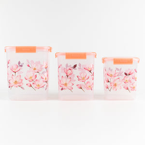 This 3-piece storage container set is perfect for elevating your kitchen organization while adding aesthetic charm. Made from premium quality BPA-free, each container features a vibrant floral print and is equipped with sturdy orange clip-lock lids to ensure airtight storage. The transparent body allows easy visibility of contents, while the secure seal preserves freshness. These containers are ideal for storing dry food, pulses, snacks, rice, flour, and more.