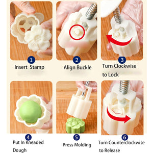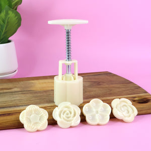 This Mooncake press mold with 4 interchangeable stamps is a versatile kitchen tool designed for baking lovers and home chefs. Made of high-quality, food-grade plastic with a spring press mechanism, it allows easy shaping of mooncakes, cookies, fondant, and pastries into beautiful floral patterns.